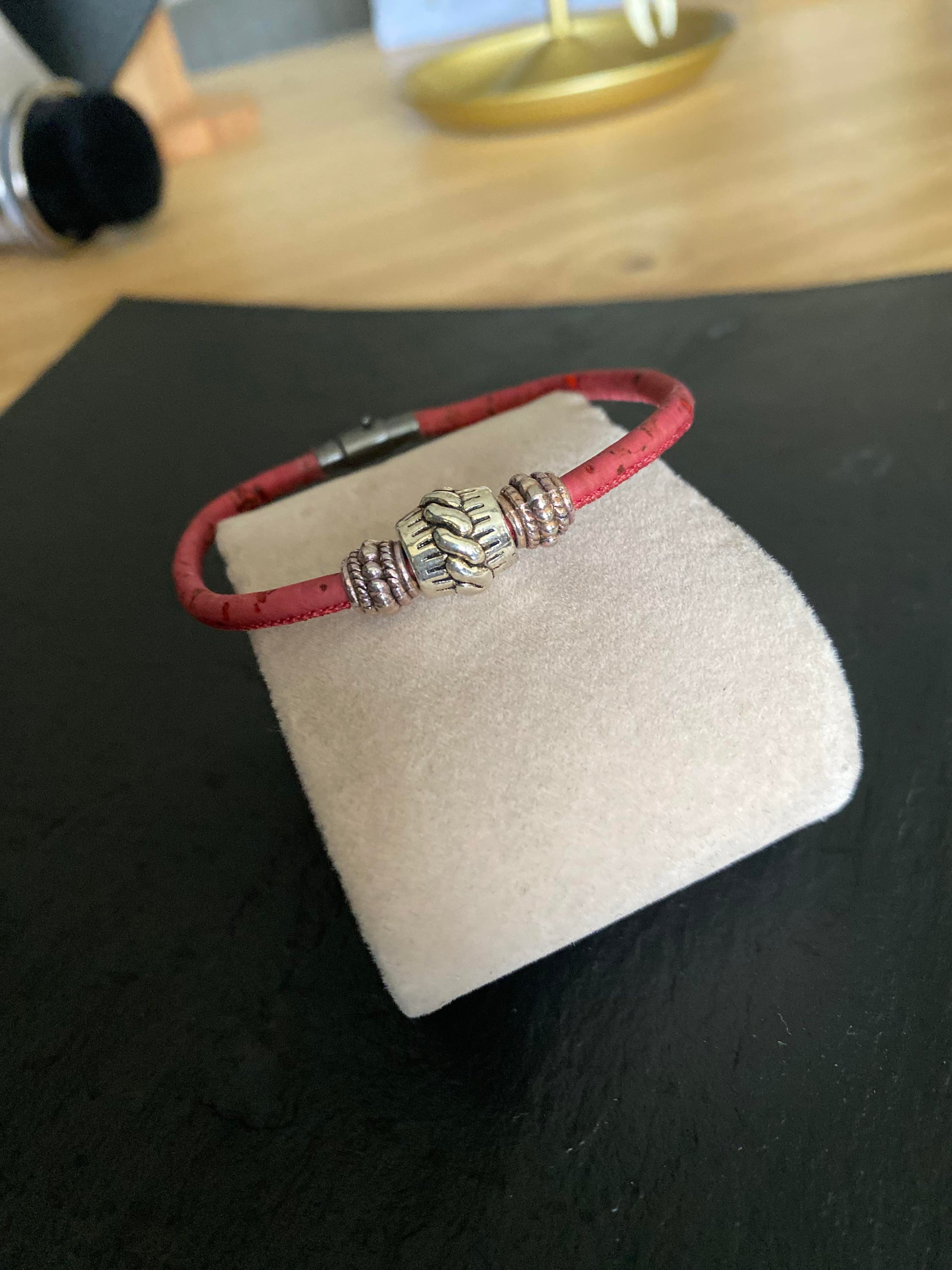 Bracelet élégant composé d'un cordons de liège et perles en argent.